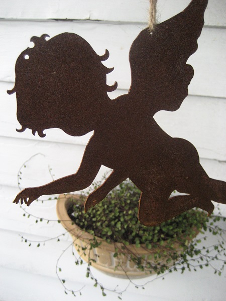 | Denne rustne engelen fikk jeg til jul, den henger i taket på trappen, og i krukken under vokser enda en pletter i luften. |
